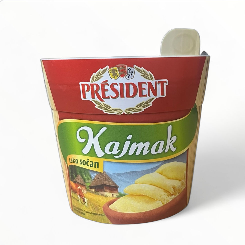 Tradiční balkánská pochoutka s jemnou, krémovou strukturou a bohatou mléčnou chutí. Kajmak President je ideální jako pomazánka na chléb, k pečenému nebo grilovanému masu, bramborám či jako doplněk k teplým i studeným jídlům.